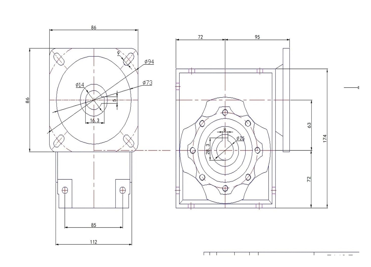 5: 1-100: 1 Worm Reducer NMRV063 Speed Gearbox 14 mm Input shaft for 86*86 Square flange motorWorm Reducer*1PCNote:We have ratio of 5:1,7.5: 1, 10: 1, 15: 1, 20: 1, 25: 1, 30:1,40: 1, 50: 1, 60: 1, 80: 1, 100:1 for customers.This connection of the worm gearbox Without the shaft of the hose and without the output worm shaft, and it is for 19mm Dia key type input shaft. When assembling this gearbox with motor, the input of the 19mm diameter can be connected directly with the key.Color: silver and blue (sometimes just one color)Material for worm reducer:housing:aluminum alloy die castWorm gear: Nodular cast iron and bronzeFeature ofworm reducer gearbox:1) High quality aluminum alloy die cast gearbox2) High accuracy worm gear and worm shaft3) Less noise and lower temperature increase4) Easy mounting anc connection, high efficiencyDrawing of the NMRV063 worm reducer:We also have worm reducerparts such asoutput shft, torque arm and output flange,If you need to click on the following link to buy:Single output shaft:Dual outputshaft:Torque arm:Output flange:The production line and stock view:Torque : 49N.m-166N.mModel Number : NMRV63/RV63Output Power : 0.25 KW- 1.5KWInput Speed about : 1500rpmOutput Speed : Varies with changes in speed ratioOutput hole diameter : 25mm