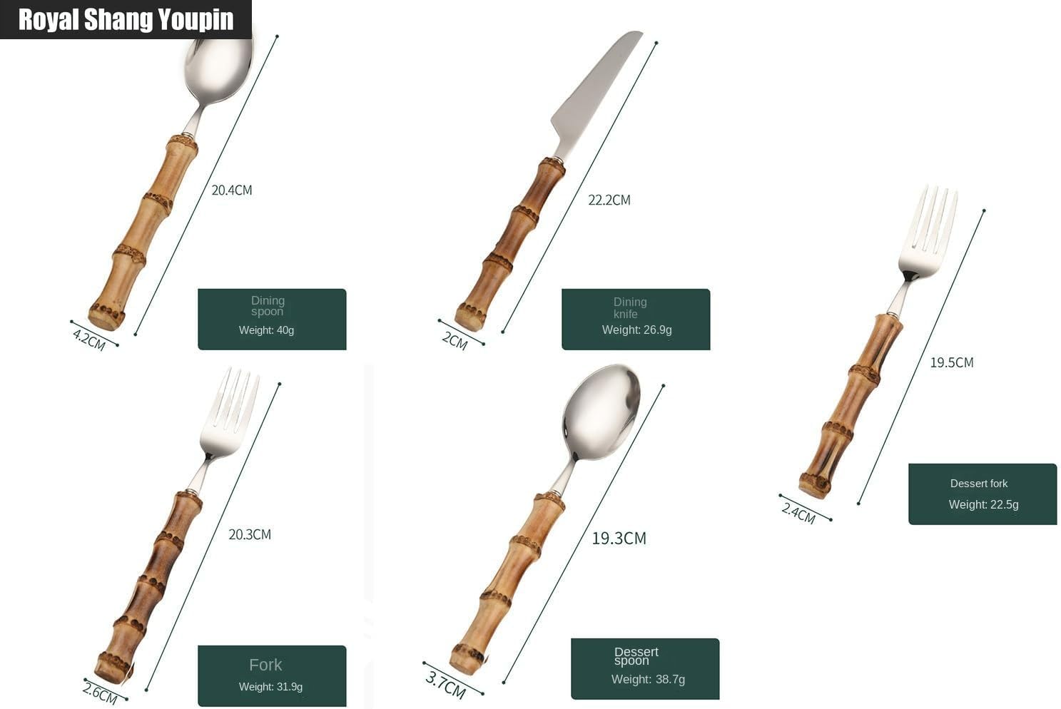 📦 Packaging quantity:5 pieces=(1 knife, 1 fork, 1 spoon, 1 teaspoon, 1 dessert fork).20 pieces=(4 knives, 4 forks, 4 spoons, 4 teaspoons, 4 dessert forks).20 pieces/gift box=(5 knives, 5 forks, 5 spoons, 5 teaspoons, 1 gift box).24 pieces/cutlery rack=(6 knives, 6 forks, 6 spoons, 6 teaspoons, 1 cutlery rack). 💕Instructions for use and maintenance💕 1. Wash carefully before first use to ensure there is no residue. 2. Clean and dry after use to ensure its durability. 3. Do not use rough and sharp materials to scrub the surface of stainless steel, stainless steel is very easy to scratch, scratching affects the beauty. So use a soft cloth. 4. Dishwasher safe so you can run it in the dishwasher to save your time. 💟Shopping Tips💟 1. Due to manual measurement, the size may have 1-2mm error. 2. There may be slight color difference due to different light of monitor and camera. 3. After receiving the package, please check whether the package is opened, whether the product is correct, if you find out of stock, wrong goods, defects and other problems, please contact us by [email], we will solve for you within 24 hours. 🤟We focus on kitchen table gadget design and constantly improve the quality, inspection and diversity of our products! Do our best to perfect and improve the quality of kitchen life! Meet the requirements and expectations of every customer!
