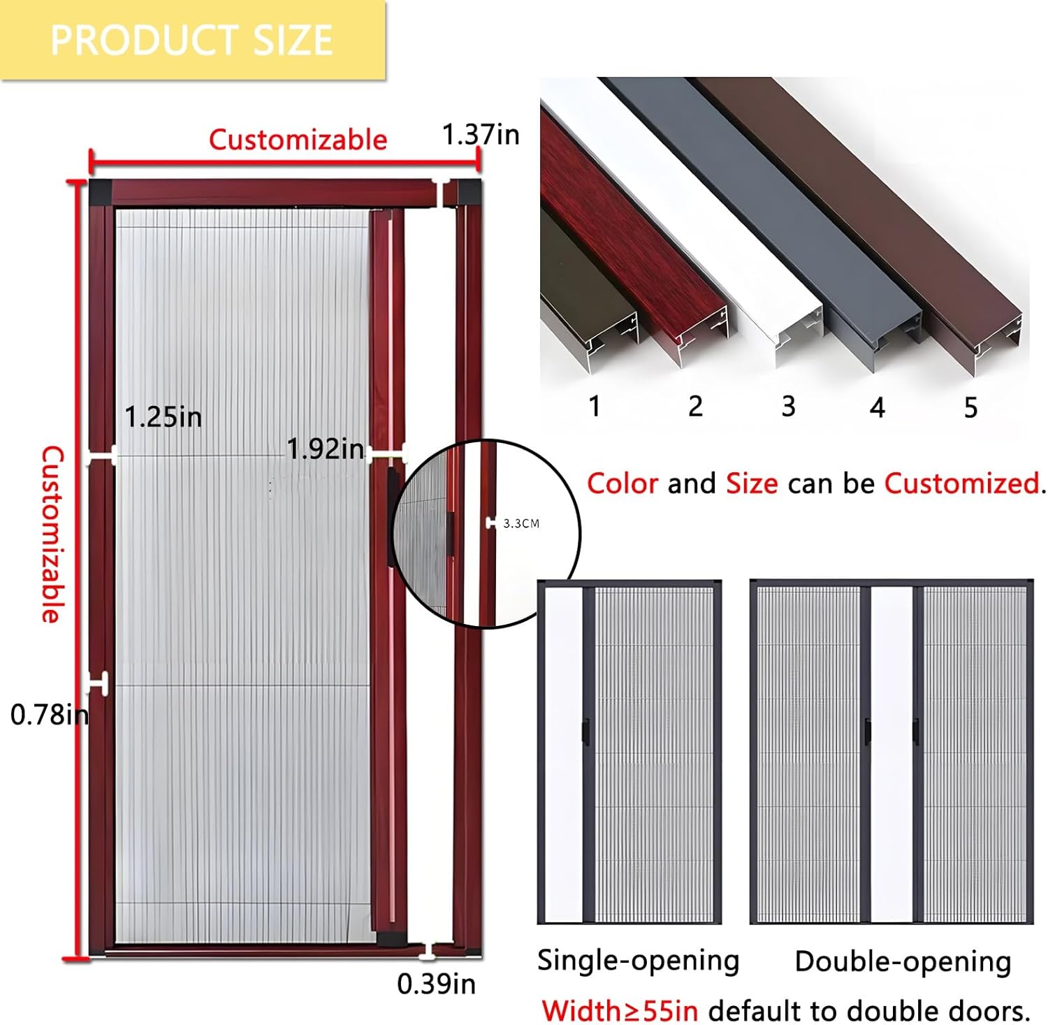 Upgrade your entryway with our premium retractable screen door, designed to provide free ventilation, space-saving convenience, and durable protection for homes, patios, RVs, and commercial spaces.Product name: Retractable Screen DoorFrame Material: Aluminum alloy+ScreenSize: Custom Size (Support accuracy up to 0.1inch)Installation method: No punch required, strong tape installation (included)Why Choose Our Retractable Screen Door?-High-Quality Fine Mesh-offer a good air circulation.-Thicker High-strength Aluminum- long service life.-Space-Saving Retractable Design,removable double handle,-Ultra-low sliding screen door track (0.4 height).The push and pull are very smooth and will not derail-Customizable door frame color and size.Please contact us by email.-Easy No-drill Installation.-Ideal for use in interior corridors, bedrooms, and living rooms, as well as entry doors, balconies, kitchens, and bathrooms in humid or outdoor areas.Packing lists:- Retractable Screen Door- All installation accessories