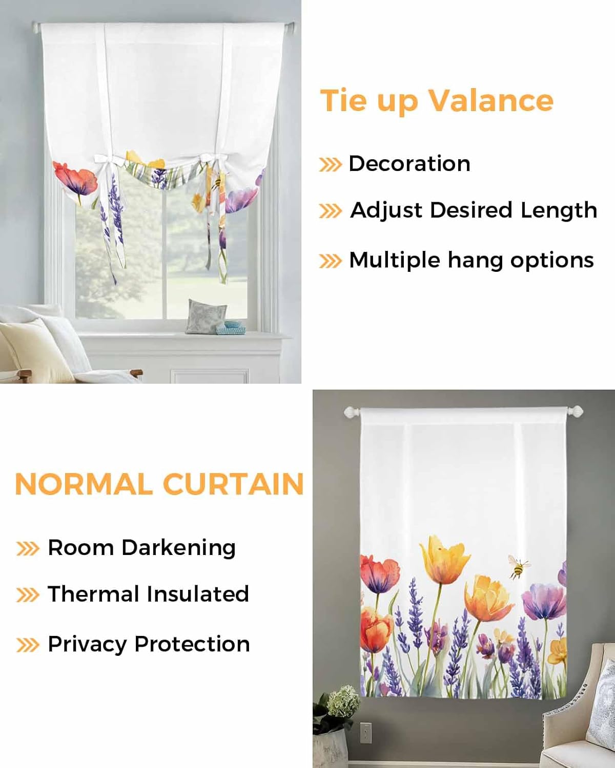 Tie Up Valances Curtain for Windows Features Liven up any small window with this window panel, providing just enough privacy, noise reduction and window coverage you need. Unique design patterns make your curtain decoration unique. Create your own decor for you and your family. Protect your eyes from bright sunlight and keep your distance from neighbors when washing and drying dishes. You can tie the functional straps at different heights for an eye-catching look. Impress your friends and family with these vivid curtain panels. This beautiful curtain is the ultimate finishing touch to your home, business office, apartment window setting. Curtains are perfect for those who want to reduce sunlight, take a nap, or avoid the sun glare on the TV. Size Chart 54 x 18 in = 137 x 45 cm 42 x 12 in = 107 x 30 cm 42 x 18 in = 107 x 45 cm 60 x 18 in = 152 x 45 cm Please forgive 1-3cm differences due to manual measurementTips Due to different monitor display and lighting effects, the picture may not reflect the actual color.